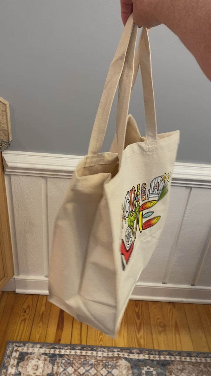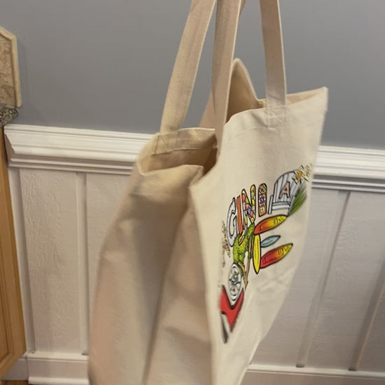 This 100% Organic Cotton reusable bag, printed with water based dyes, is super durable for grocery shopping, transporting text books to class or shopping at your favorite local stores!